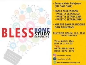Belajar jadi lebih mudah, intensif, dan terarah bersama Bless Home Study. Kami melayani Bimbel SD–SMP–SMA, Homeschooling Paket A/B/C, serta kursus Bahasa Inggris, Mandarin, dan Akuntansi.