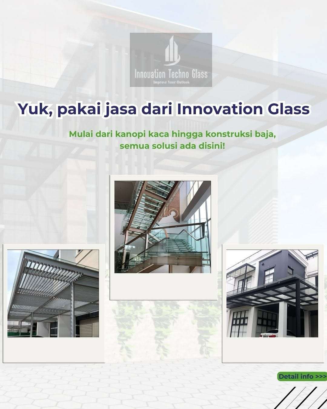 Masih pakai kanopi konvensional yang cepat melembap, bocor, atau terlihat kumuh termakan usia? Saatnya beralih ke Kanopi Innovation Techno Glass! Solusi konstruksi kaca modern yang tahan lama, aman, dan bikin tampilan eksterior Anda makin mewah.